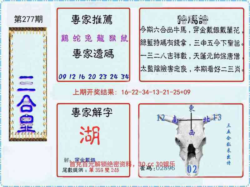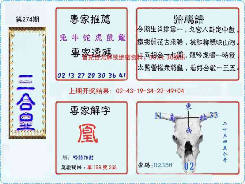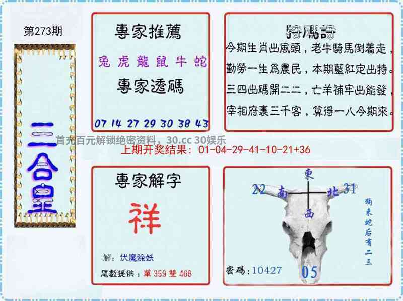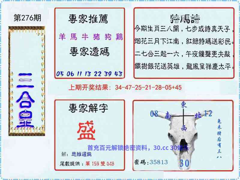 【解三合皇图】开:鸡09 276期特码诗:今期生肖三八開,七步成詩真天子,烟花三月下江南,紅綠特碼送彩民。二七合三起一六,午夜鐘聲更夫敲,鐵樹銀花送英雄,龍風呈祥慶太平。 【专家推荐】羊马牛猪狗鸡 ![]() |
